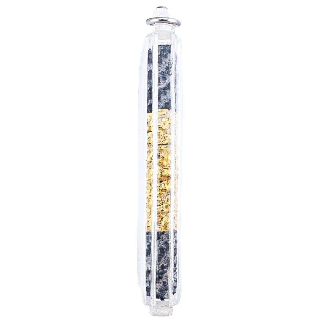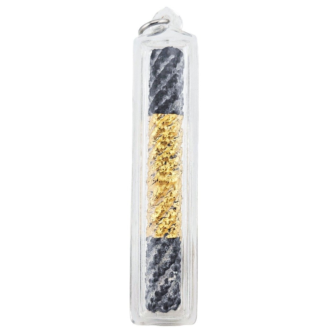 Within the casing, a braided, gold foil covered takrut sits inside.
