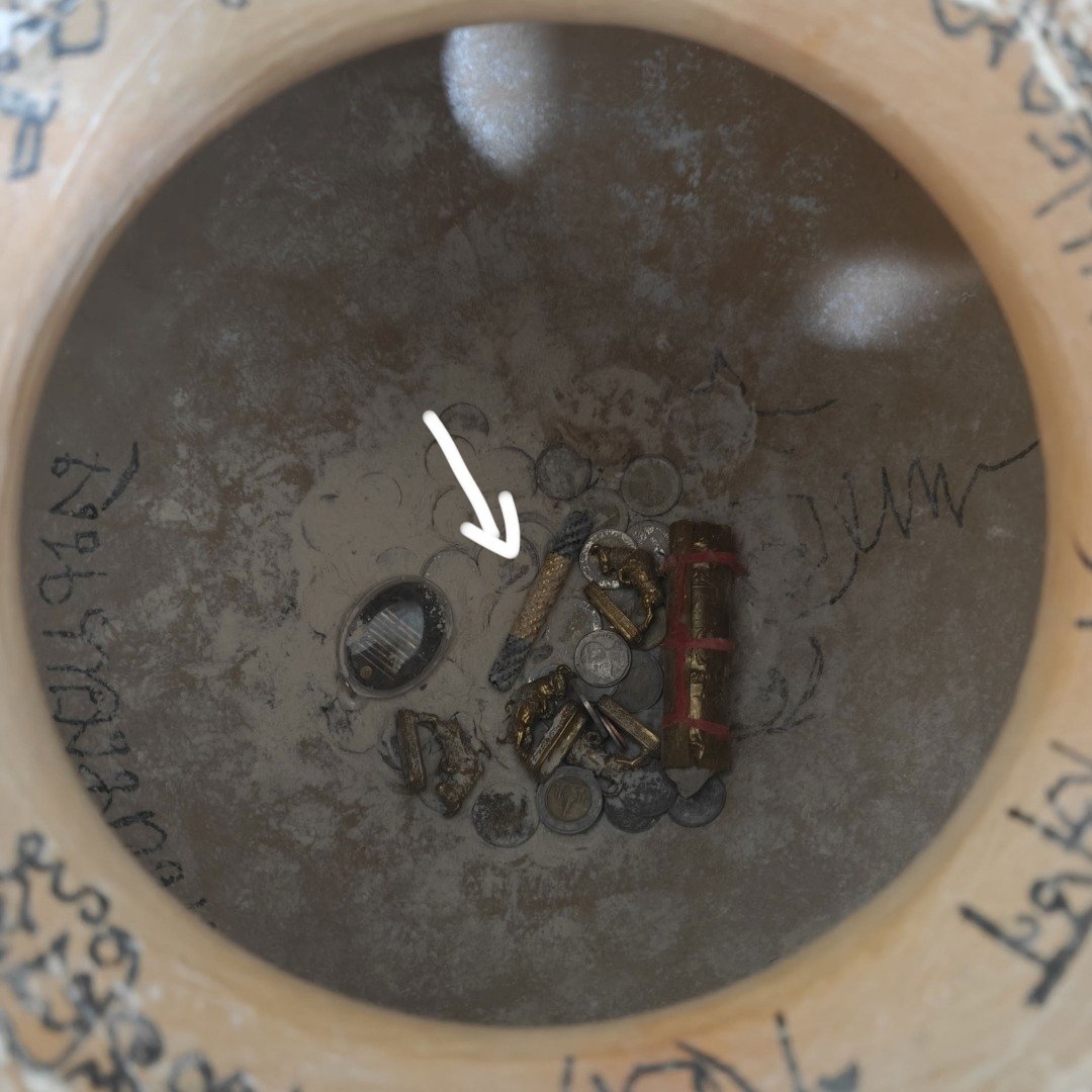 Within that pot, you find a mix of coins, sacred powder, and a few amulets.
