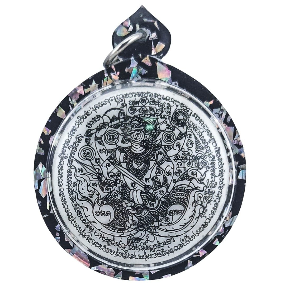 Inside the locket, the engraved yantra sits together with the sacred Muan Sarn compound, forming the spiritual heart of the amulet.
