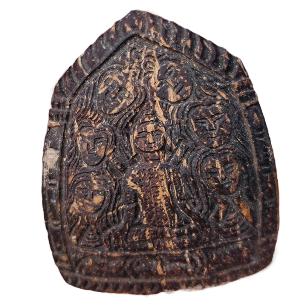 On the surface, it presents a hauntingly beautiful depiction of Khun Paen, carved from sacred one-eye coconut โ already a rarity on its own. Surrounding him: ๐๐ถ๐ ๐ณ๐น๐ผ๐ฎ๐๐ถ๐ป๐ด ๐ณ๐ฒ๐บ๐ฎ๐น๐ฒ ๐ต๐ฒ๐ฎ๐ฑ๐, symbolising his many wivesโฆ but also hinting at something far more enigmatic on the reverse.