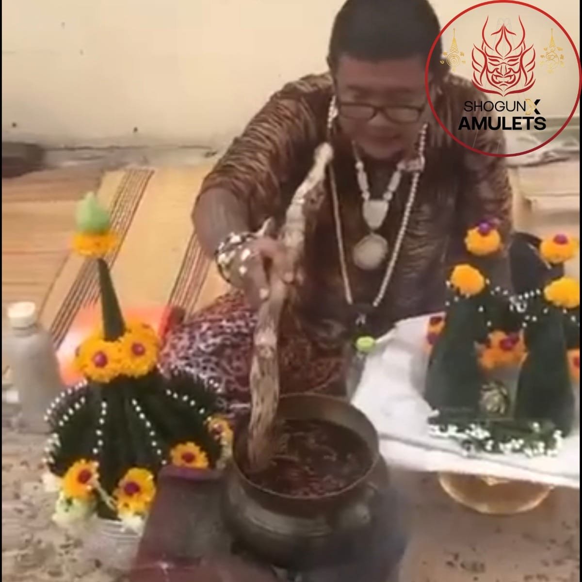 The ritual takes place at a cross-junction outside a temple gate, a spiritually charged location chosen specifically for this wicca. During the boiling of materials, Phu Lersi Pong stirs constantly while chanting, maintaining intense focus for hours. It is a disciplined, demanding, and spiritually heavy practice crafted only for wicca intended to shape reality.