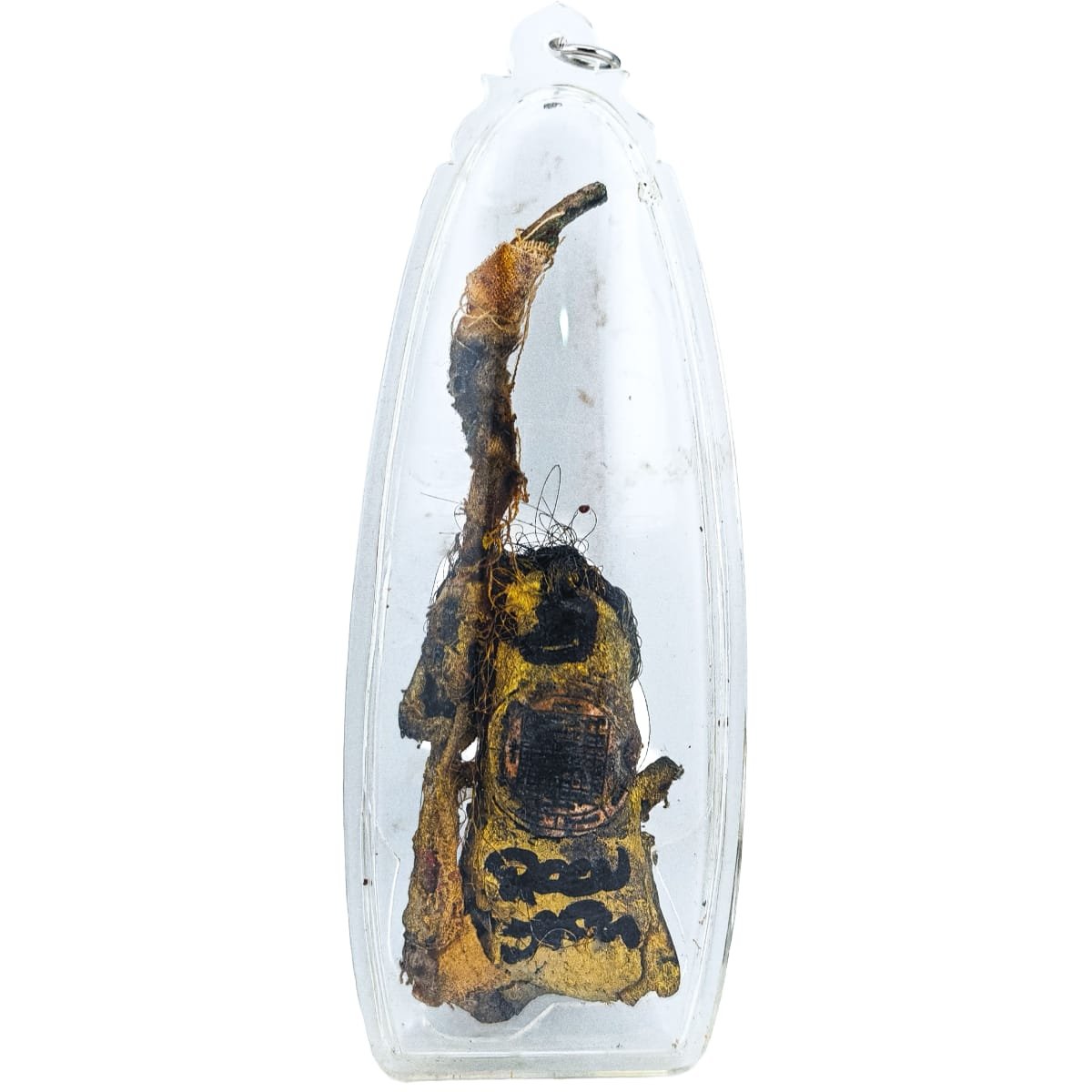 =””>Ajarn Tom used metal parts and nails from old coffins to form the body, binding them with sai sin threads and covering them with prai relics. At the back, he added panneng fragments, nam man prai, and other prai ingredients to reinforce its strength.