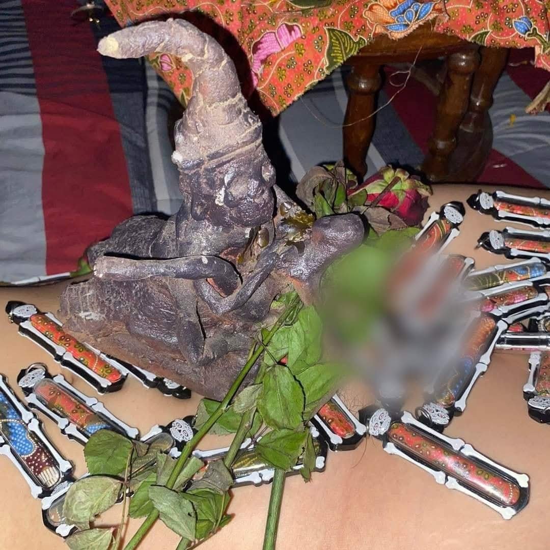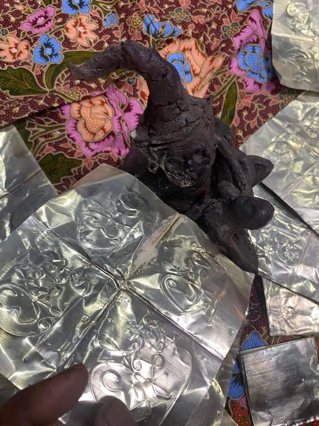 • Wrapped each piece using the bedsheet used during the ceremony, infused with ritual energy and fluids