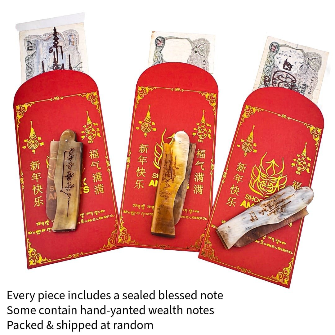 Additionally, some notes contain hand drawn yanted by Phu Lersi Pong and function as wealth yant notes. We seal all notes first, then mix and pack them randomly. We also do not track which pack contains the hand-yanted version.